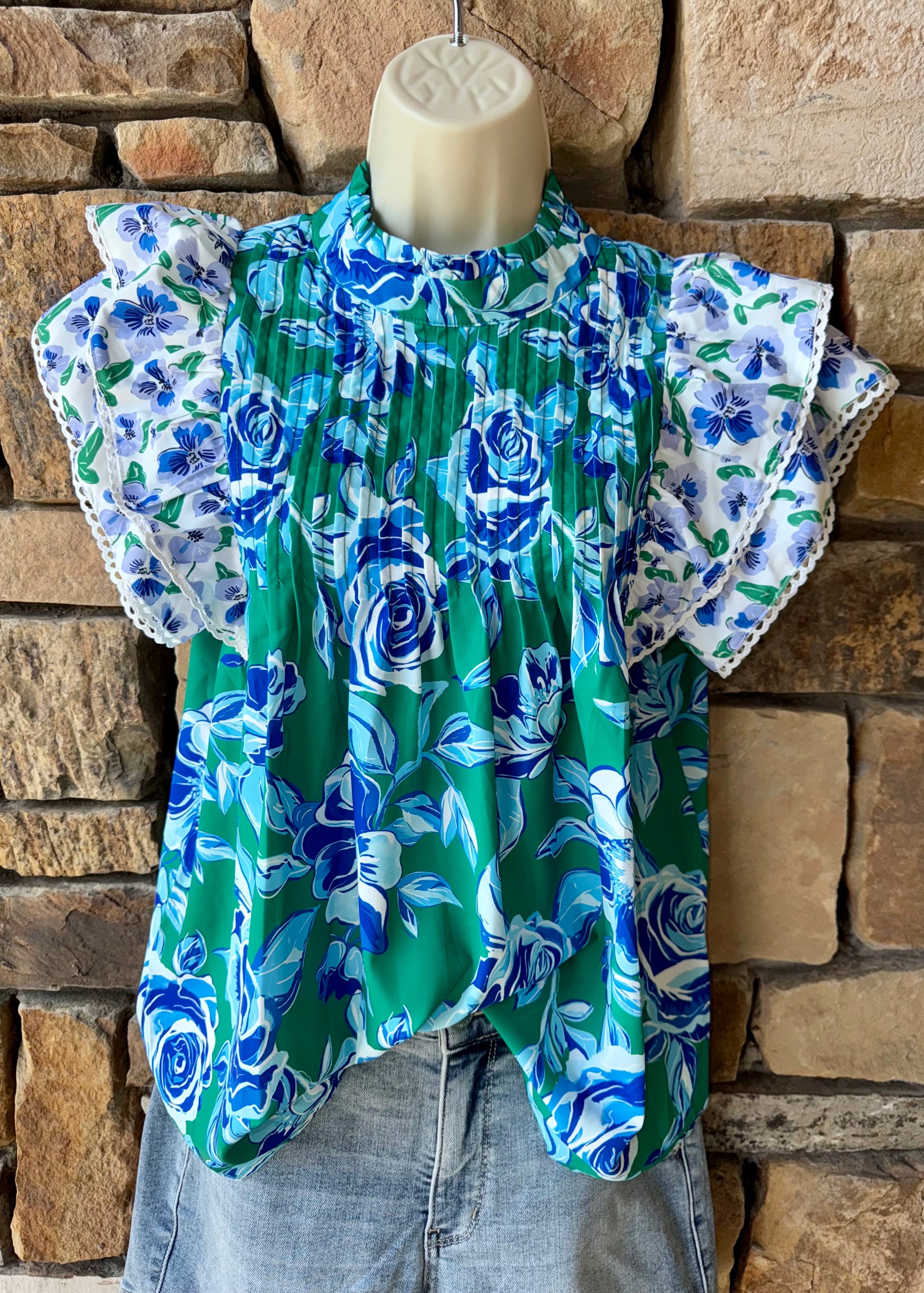 Bring a burst of fresh blooms to your wardrobe with this vibrant pleated blouse. Featuring a rich green base adorned with bold blue rose prints, this top is a true statement piece. The contrasting flutter sleeves in a delicate white floral print add a playful layered look, while the high neckline and flowy fit keep it effortlessly chic. Perfect for pairing with denim shorts for a sunny day out or dressing up with white trousers for brunch.