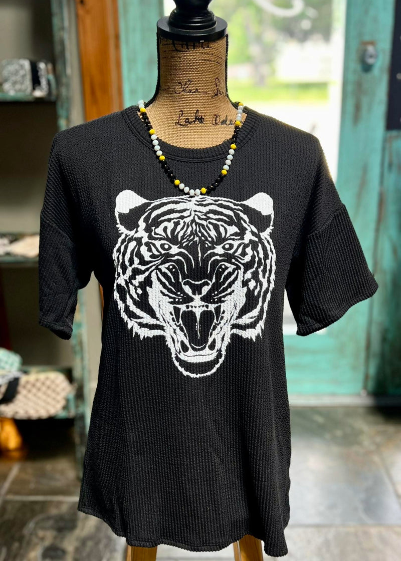 We are spicing it up for all of our Tiger peeps! This one is screen printed on a trendy ribbed t-shirt. Accessorize with your favorite school color and BAM!!! Fits true to size.