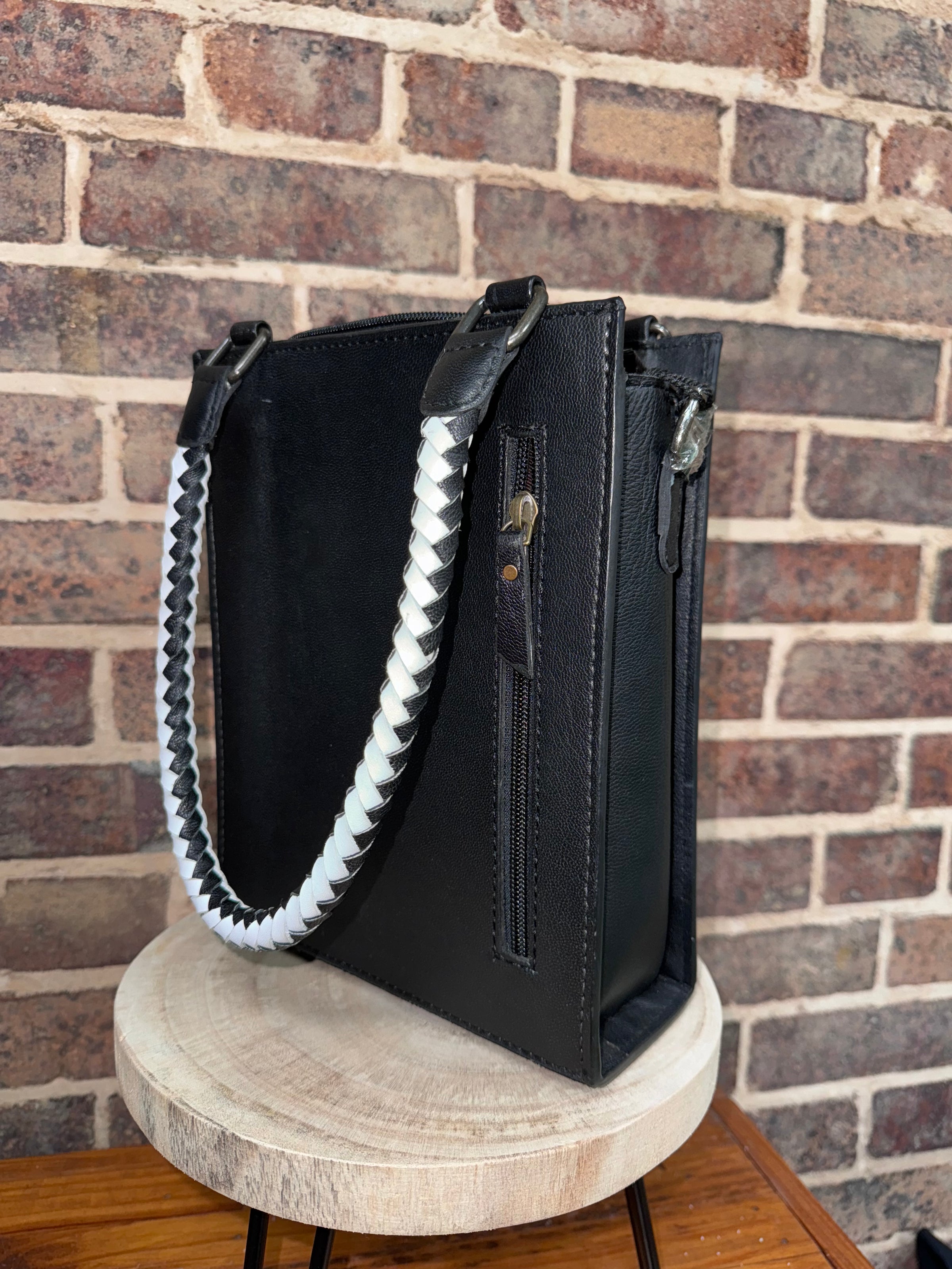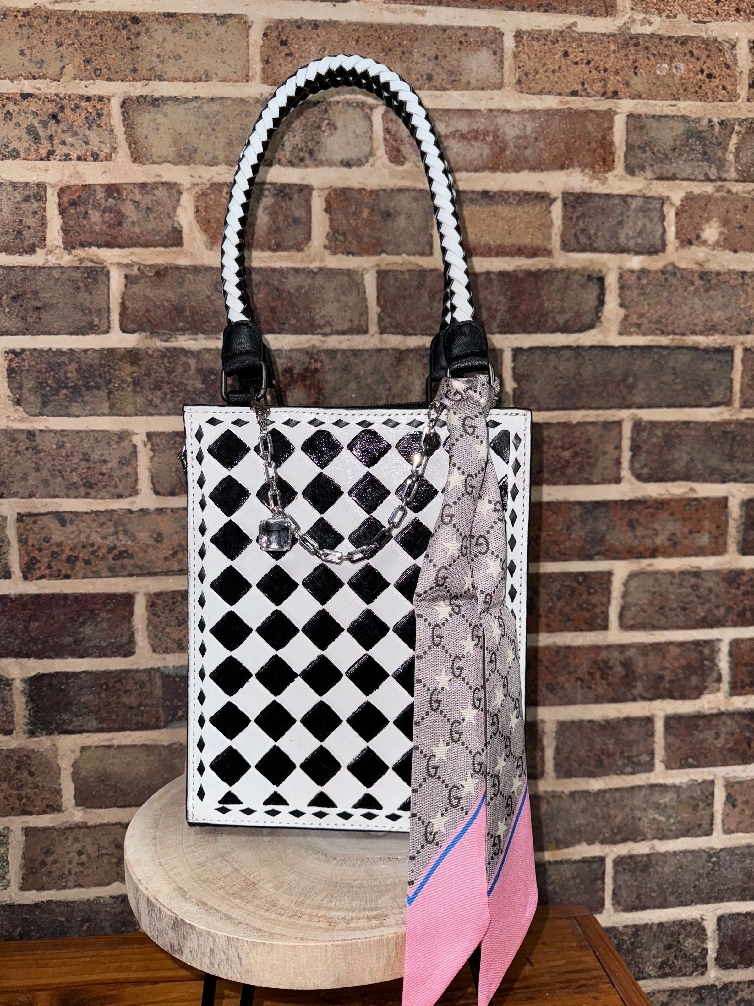 Handcrafted tooled leather tote featuring a striking checkered pattern that showcases traditional leatherworking artistry. This compact design combines functionality with distinctive style, perfect for everyday essentials or as a statement accessory. The durable leather construction ensures longevity, while the intricate tooling adds character and sophistication. An ideal choice for those who appreciate quality craftsmanship and timeless design.